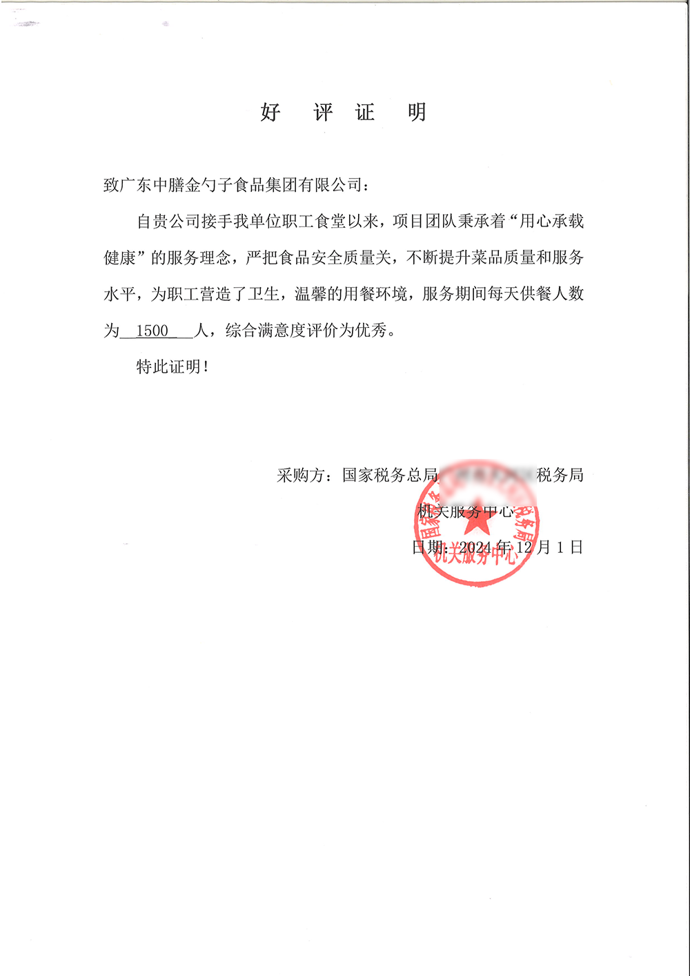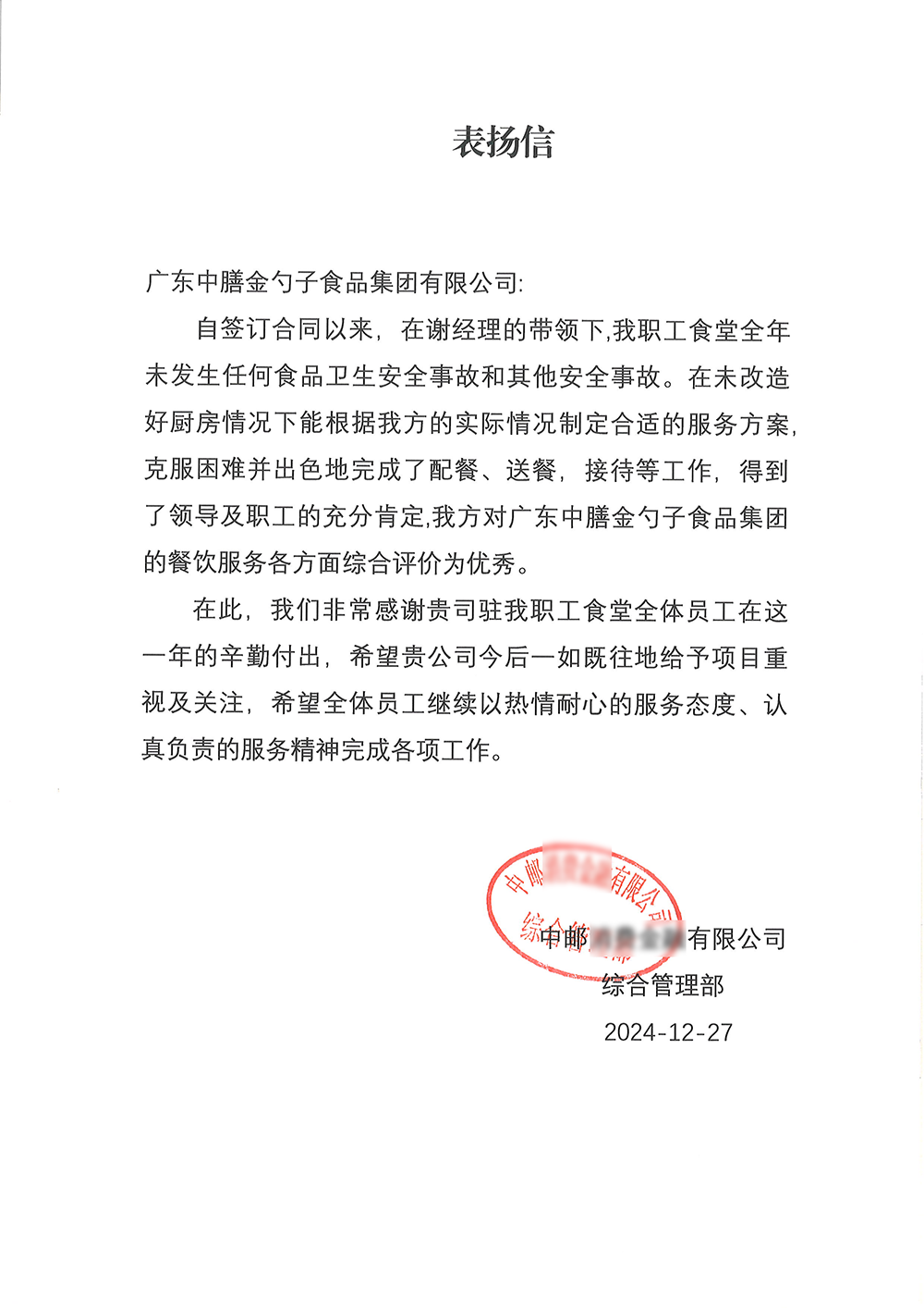 6、2024年7月,金勺子食品集團董事長黃金盾榮獲“2024團餐服務優秀青年企業家”稱號。