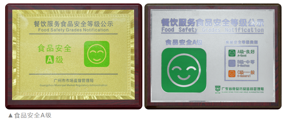 經(jīng)裝修升級后,金勺子餐飲項目704門店環(huán)境舒適優(yōu)美、食品留樣食品檢測、后廚標識清晰、工具擺放到位、臺賬上墻、記錄在冊等,整體服務(wù)及食品安全管理水平較高,先后被廣東省食品藥品監(jiān)督管理局和廣州市市場監(jiān)督管理局授予“食品安全A級”榮譽。